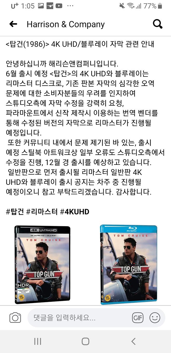 얼마전에 탑건 구판 블루레이 사서 아직 안봤는데 그냥 알라몰 중고 처분하고 4K 신판 사야겠습니다. 조금 더 기다릴걸 아깝긴 하네요.