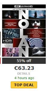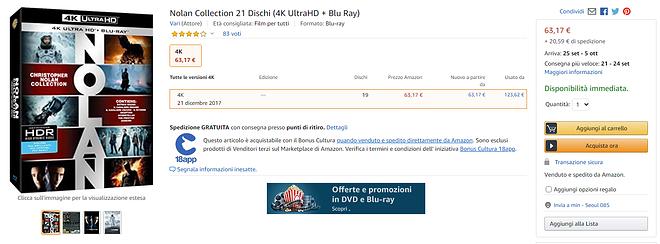 가격이 좋네요^^ 그런데 지난 8월 이탈리아 아마존에서 워너 4K or 워너 박스세트를 대상으로 50% 파격 할인 행사를 할 때 놀란 4K 박스세트를 이미 구입하신 분들이 아마 많으실 것 같아요. 저도 지난 8월 행사 때 놀란 4K 박스세트를 구입했는데 지금 생각해도 거짓말 같은 가격에 구입한 것 같아요. 배대지가 아니라 직배여서 세금을 뺀 48.78유로에서 50% 할인까지 해줘서 물건값만 24.39유로였어요. 당시 결제된 환율+수수료(1유로 당 1428.710562원)로 계산해보니까 34846.25061원이라고 나오네요. 총 5개 타이틀의 배송료가 23.26유로였는데, 단순히 1/5을 해서 놀란 4K 박스세트 구입에 든 비용을 계산해보니까 48.78/2+(23.26/5)=29.042유로가 나오고 원화로는 41492.61214원입니다. 총 일곱 작품 21디스크 중에서 4K 디스크 7개, 부가영상 디스크 7개, 블루레이 디스크 2개(다크나이트, 다크나이트 라이즈), 총 16디스크에 한국어 자막이 있어서 완벽한 박스세트는 아니었지만, 34,900원도 안 되는 놀란 4K 박스세트를 배송비 감안해서 41,500원(작품 당 6,000원도 안 됨)도 안 되는 가격에 이탈리아로부터 공수받았다는 게 지금도 믿기지가 않네요! 아마 이 가격은 다시 만날 수 없을 가격이 아닐는지..