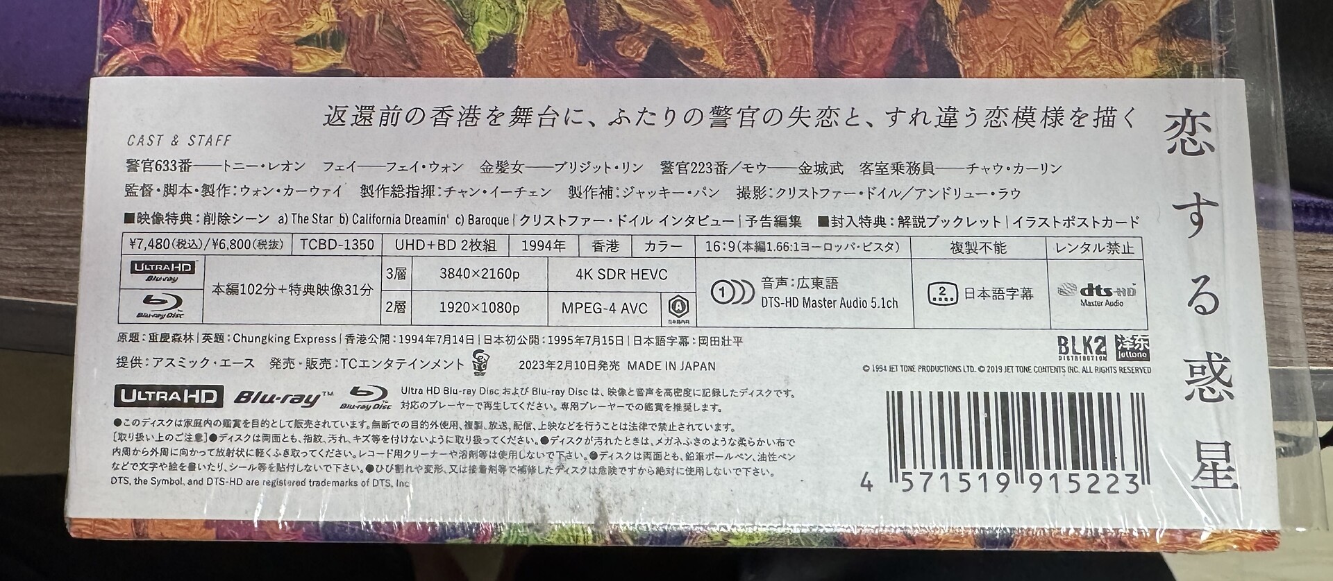 프랑스판 4k 판인데 당시에는 좀더 깨끗한 화질로 보자, 안본 서플이 있을것이다. 이런 생각으로 하나만 구입했습니다. 이 영화는 반드시 애로우에서 4k로 출시해서 대만판이 포함되어야할 영화입니다. 왕걸의 노래에 펼쳐지는 버스터미널 이별씬이야 말로 진정한... ㅋㅋㅋ