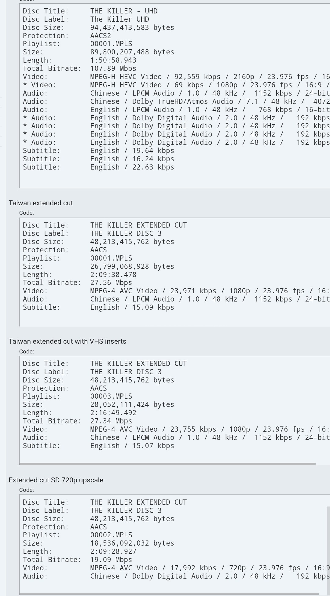 제품이 와야 알겠지만 디스크 정보에 136분 확장판은 1080p로 적힌 걸로 봐서 130분 확장판+VHS영상으로 패치워크 한걸로 추정됩니다.