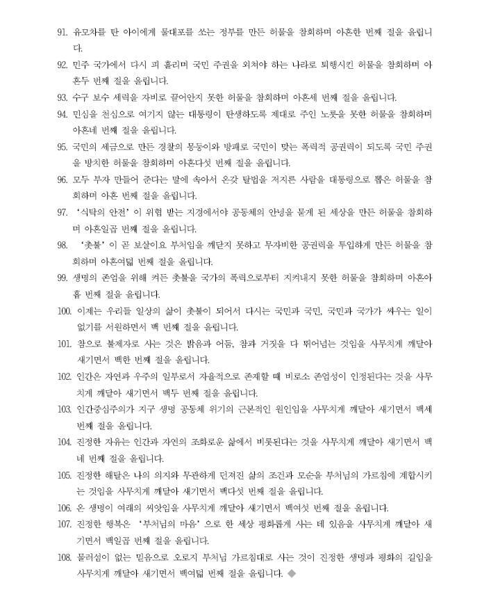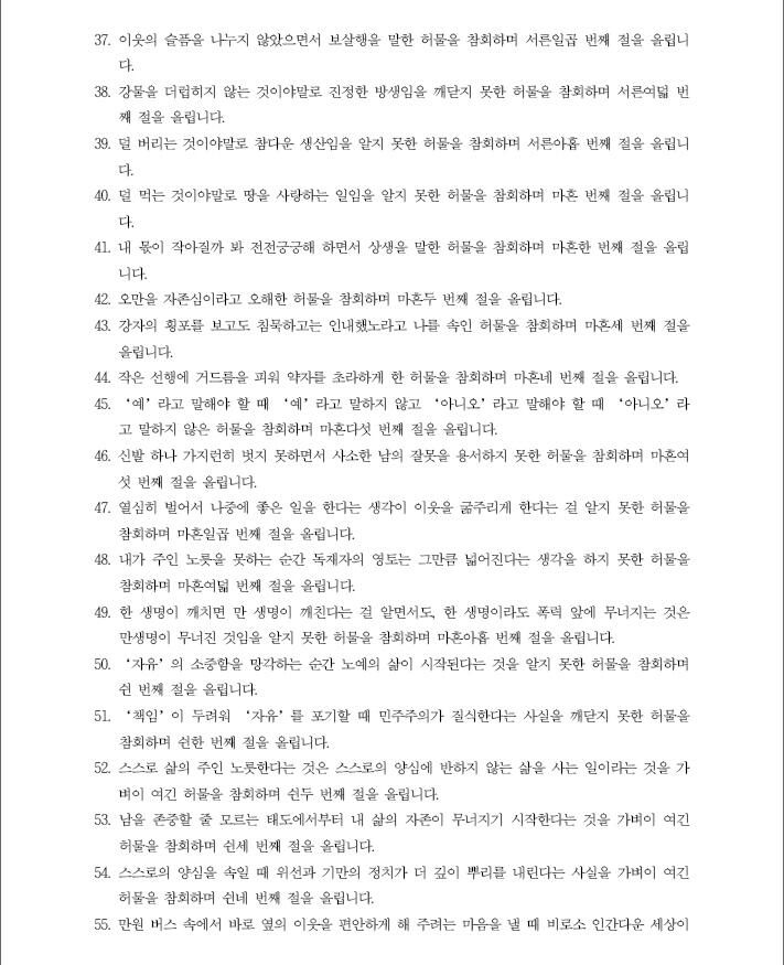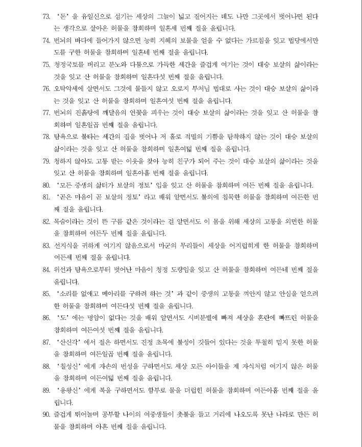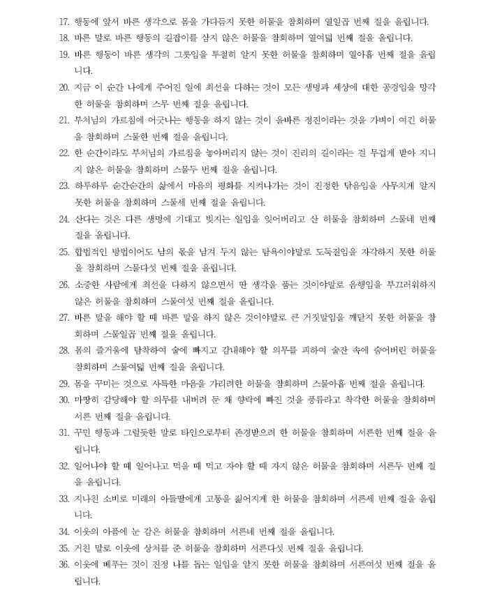 47. 열심히 벌어서 나중에 좋은 일을 한다는 생각이 이웃을 굶주리게 한다는 걸 알지 못한 허물을 참회하며 마흔일곱 번째 절을 올립니다. 제게 인상깊은 구절입니다.