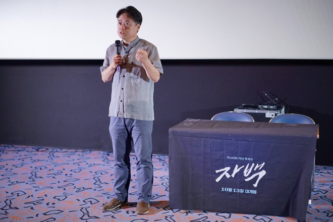 짤방은 자백 시사회장에서 관객들과 대화하기는 감독님 사진입니다.