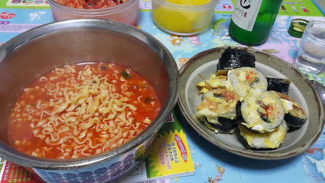 제가 좋아하는 안주 조합입니다 라면에 계란 김밥... 집에서 혼자 먹으니 편하고 좋네요 ^^