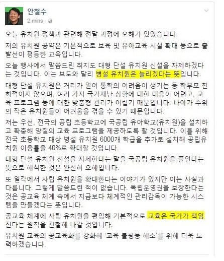 지금 사립유치원장들 저 글보면 뒷목 잡으실 듯.. "철수가 우리 뒤통수를..
