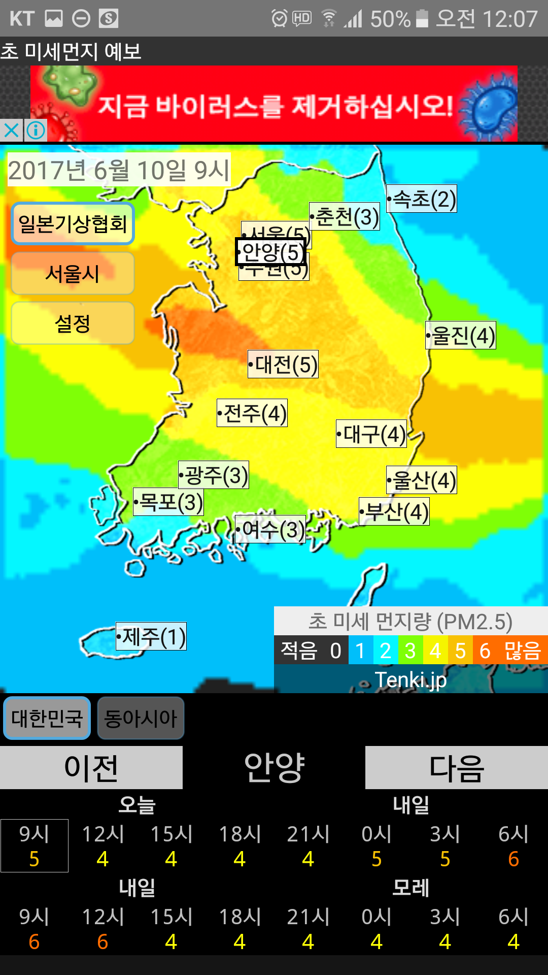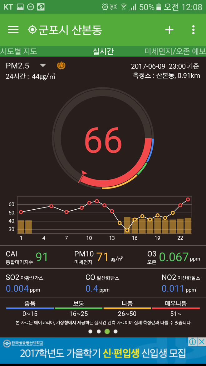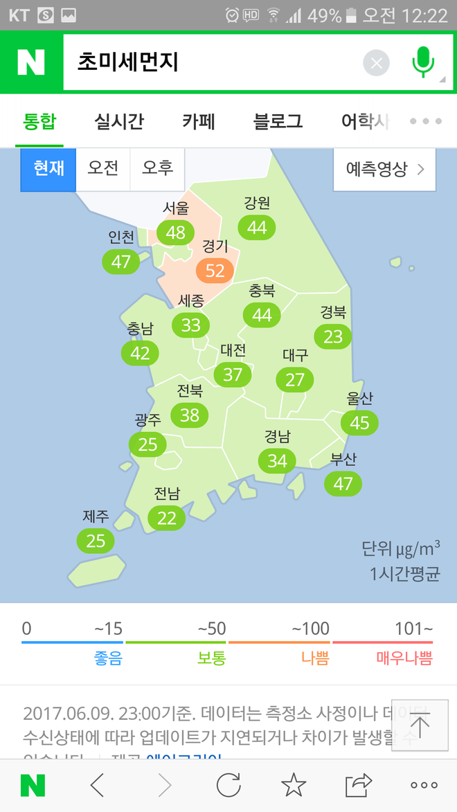 포털에는 우리나라 환경기준으로 나오고 어플들은 WHO기준으로 나와서 차이가 있을겁니다.