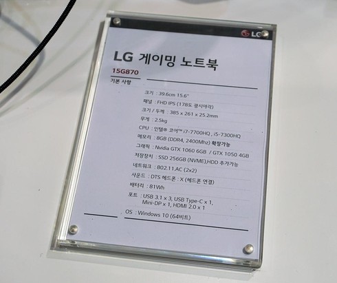 LG전자는 5월 25일부터 나흘간 일산 킨텍스서 열리는 게임 전시회 '플레이엑스포'에서 자사 최초의 게이밍 노트북 'LG 게이밍 노트북(모델명 15G870)'을 공개한다. 6월 출시 예정이며 가격은 미정이다.