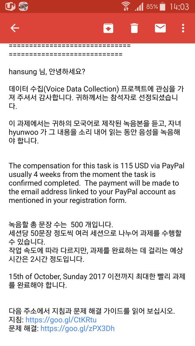 음성인식 데이터 수집이군요. 생각보다 단가가 좋네요.