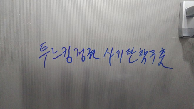 잠실역 화장실에 볼일 보러 갔다가 기분만 잡쳤네요. 자기 목소리를 똥깐 문짝에 휘갈겨 표현하는 정도밖에 안되는 비열함과 추잡함에 할 말을 잃었습니다. 뭐 하는 소리가 늘 개똥같은 소리만 하는 인간들이니 납득은 갑니다.