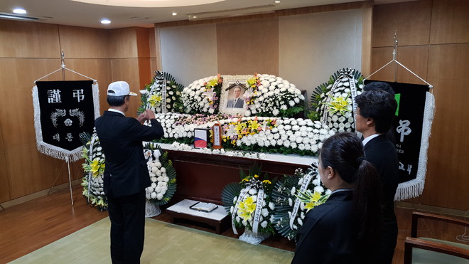 본인의 신분을 국가유공자 서울시 ○○지회 로 밝히신 선생님께서는, 고인의 위패 곁에 태극기를 세우신 뒤 근조기를 꺼내 설치하시기 시작했습니다.