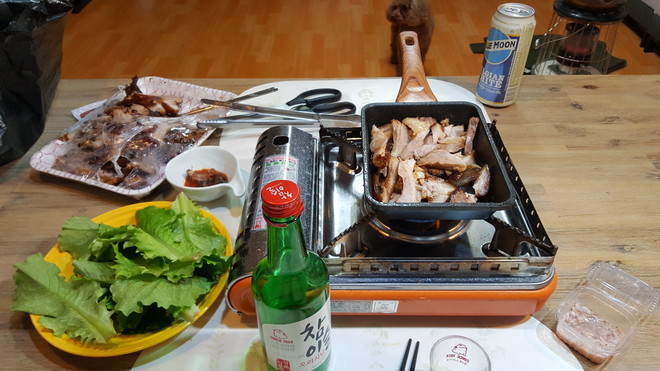 족발 기름에 고기를 구우니