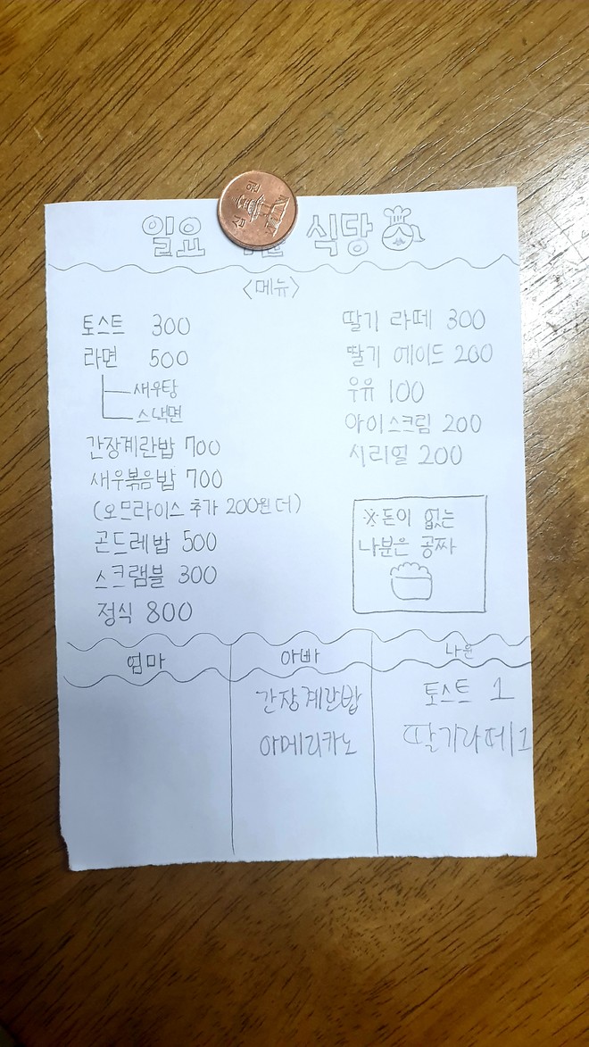 큰애가 6학년입니다. 어젯밤에 무언가를 종이에 쓰더니 오늘아침 늦게까지 침대에 누워있는 저에게 메뉴를 고르게 하네요. 인증샷을 올려야 하는데 급하게 먹느라 사진이 없습니다.(이전에 찍은 라떼 사진으로 대신...) 저는 계란밥에 드립커피 동생은 토스트에 딸기라떼 엄마는 아파서 못먹고 침대에 누워있네요.