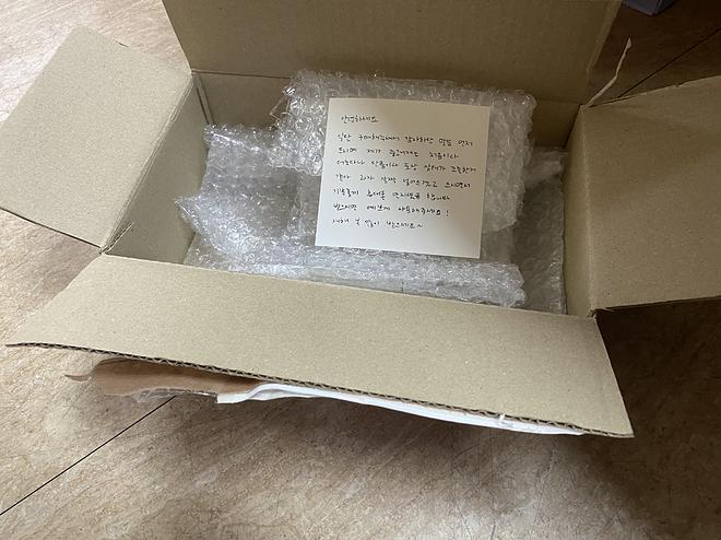 직장상사용 아이폰SE를 샀는데 파는 분이 첫거래라서 쑥쓰러우셨는지 손편지와 함께 빈츠 두개를 넣어서 보내주셨네요. 편지만으로도 참 훈훈했던데다 물건까지 최상급이여서 참 기분좋은 거래였습니다. 상사분 폰드리고 과자먹은 후에 찍은 거라 좀 황량하긴 하군요.