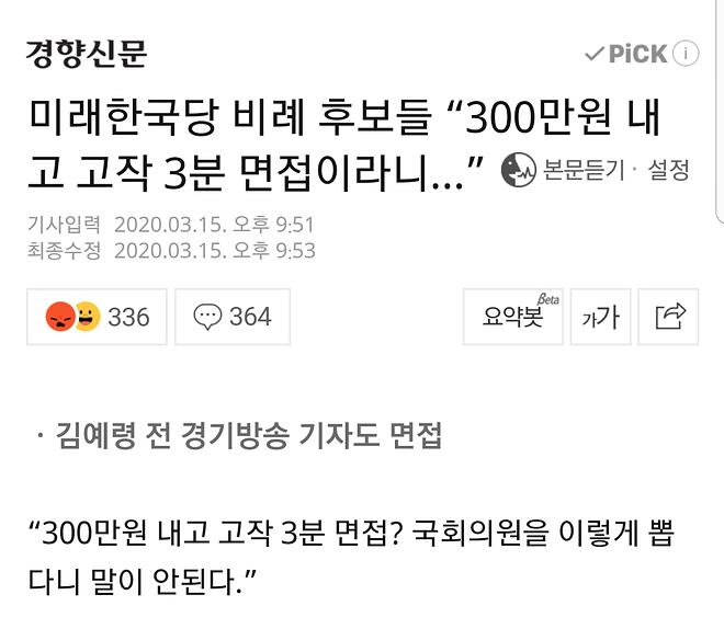 [시사정치] 미래한국당 비례 후보들 “300만원 내고 고작 3분 면접이라니…”