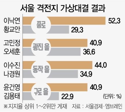 여론조사기관인 엠브레인퍼블릭에 의뢰해 지난 20~21일 종로·광진을·동작을·구로을 선거구에 거주하는 만 18세 이상 남녀 각각 500여명을 설문조사한 결과에 따르면 종로에서 이낙연 민주당 코로나19국난극복위원장이 52.3%의 지지율로 황교안 통합당 대표(29.3%)를 23%포인트 차로 제쳤다. 동작을에서는 민주당의 이수진 전 판사(44%)가 나경원 통합당 의원(34.9%)보다 앞섰고, 구로을에서는 민주당의 윤건영 전 청와대 국정기획상황실장(40.9%)이 김용태 통합당 의원(22.9%)을 눌렀다. 표본오차가 ±4.4%포인트라는 점을 감안하면 세 곳은 오차범위를 벗어난 결과다. 광진을의 고 전 대변인(40.9%)과 오 전 시장(36.6%)만이 오차범위 안에서 박빙세를 보였다.