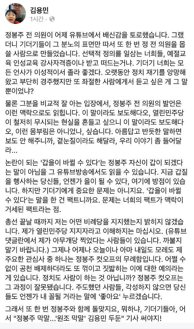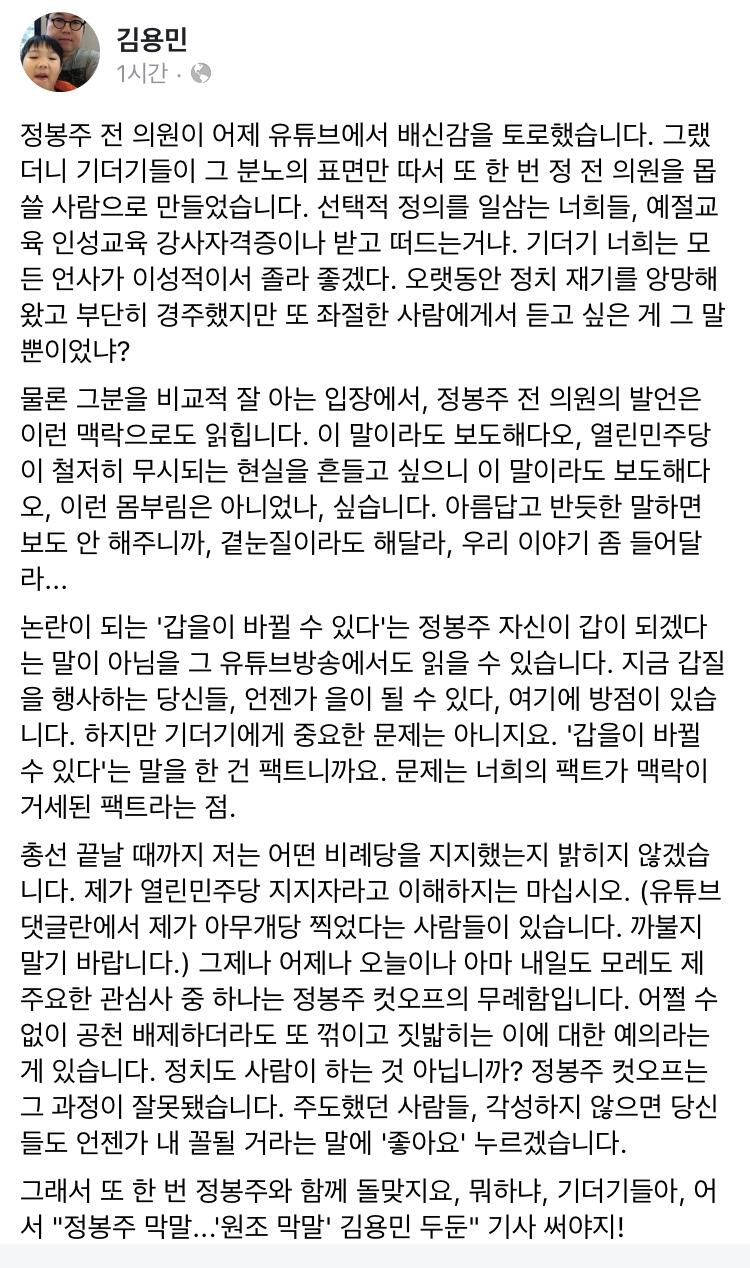 총선 끝날 때까지 저는 어떤 비례당을 지지했는지 밝히지 않겠습니다. 제가 열린민주당 지지자라고 이해하지는 마십시오. (유튜브 댓글란에서 제가 아무개당 찍었다는 사람들이 있습니다. 까불지 말기 바랍니다.) 그제나 어제나 오늘이나 아마 내일도 모레도 제 주요한 관심사 중 하나는 정봉주 컷오프의 무례함입니다. 어쩔 수 없이 공천 배제하더라도 또 꺾이고 짓밟히는 이에 대한 예의라는 게 있습니다. 정치도 사람이 하는 것 아닙니까? 정봉주 컷오프는 그 과정이 잘못됐습니다. 주도했던 사람들, 각성하지 않으면 당신들도 언젠가 내 꼴될 거라는 말에 '좋아요' 누르겠습니다.