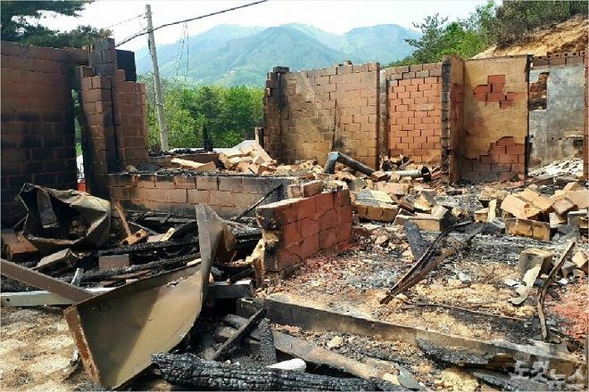 발화지점에서 270m 정도 떨어진 곳에서 비닐하우스 2동도 뼈대만 앙상히 남기고 타버린 흔적이 보였다. 이번 산불로 주택과 비닐하우스, 우사 등 6동이 불에 탔고, 산림 85ha가 소실된 것으로 잠정 추정된다.