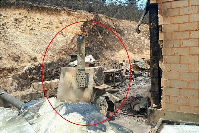 집 뒤쪽에서 화목보일러 연통 일부가 눈에 띄었다. 연통 역시 까맣게 그을려 있어 당시 화재 위력을 짐작게 했다. 집으로 진입하는 입구에는 화목보일러 땔감으로 사용했던 것으로 추정되는 나무들이 차곡차곡 정리돼 있었다.