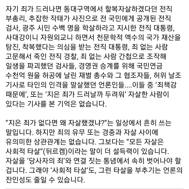 두번째는 억울한 사람들입니다. 자신이 믿었던 신념이 조롱당하고 자신이 믿었던 사람들에게 배신당하고 변명할 여지 조차 남겨지지 않게 되면 극단적 선택을 하게되는 거겠지요.