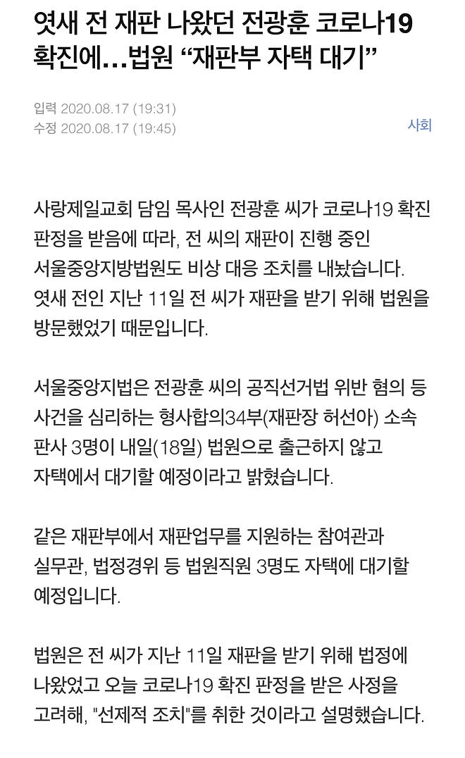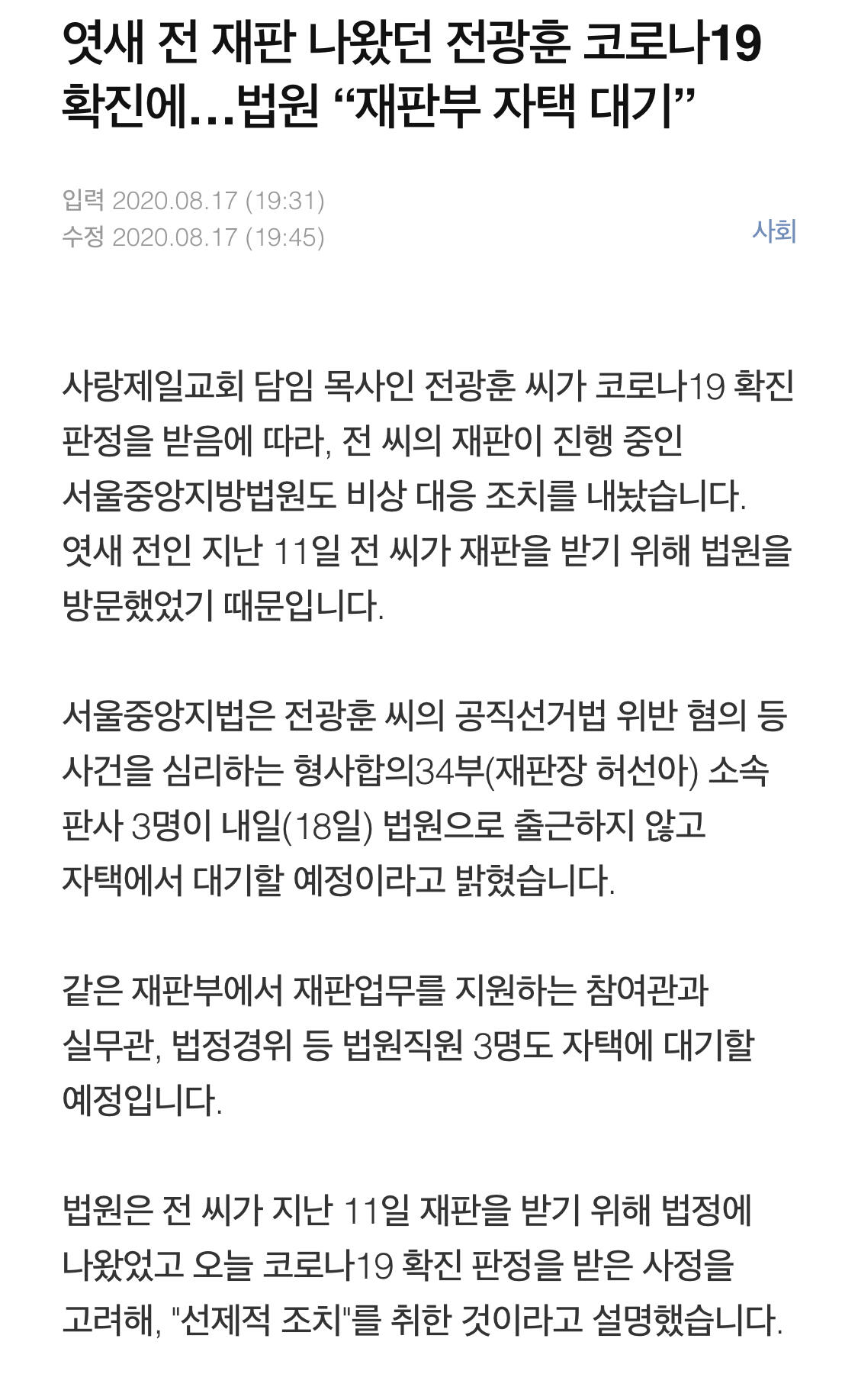 재판 중에 감염 사례가 없을텐데? 쫄보같이 왜 그래 니가 그 잘난 머리로 내린 판단이잖아.