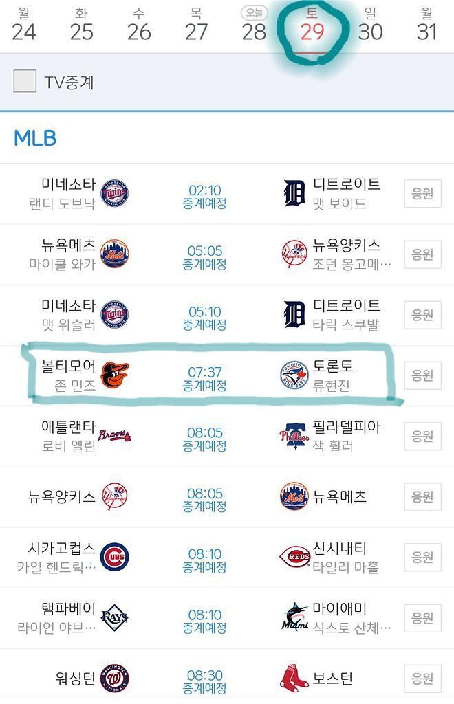 내일 토요일 아침입니다. 토요일이라 국내팬들에겐 오늘 우천취소가 다행이었네요.