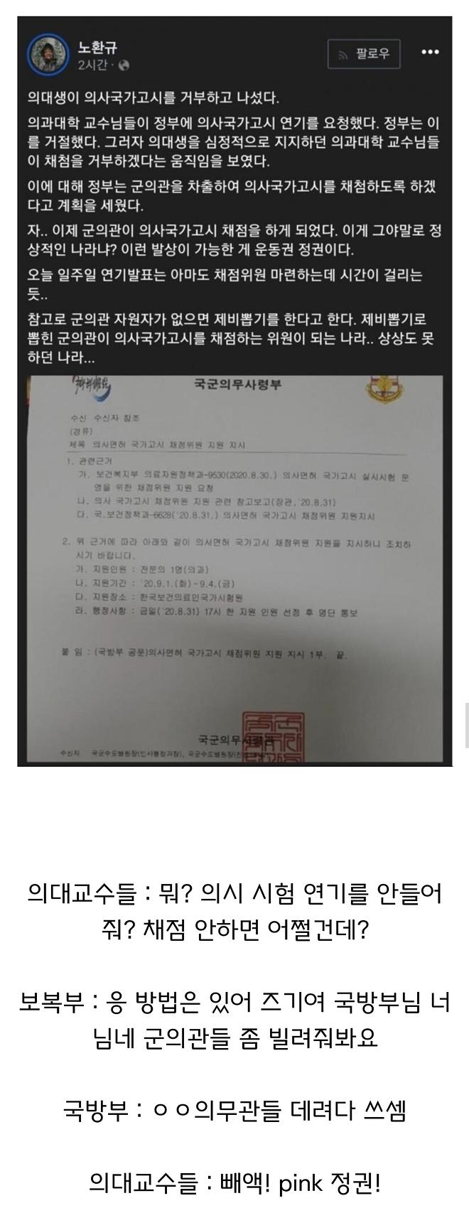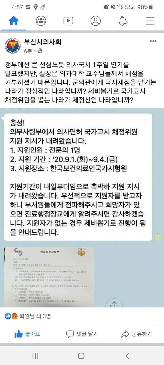 1주일 연기됐으니 담주는 어떻게 될지 궁금하네요. 담주에 군의관들이 채점을 하게 될지 아님 의대교수들이 하게 될지.