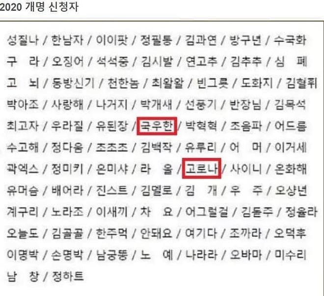 그리고 저기 나온 이름들은 2016년도 개명 신청했다는 명단이라고 인터넷에 있습니다. 그것조차도 구라로 짐작되지만요. (안나 대신 국우한, 고구마를 고로나로 바꿔치기했네요.)