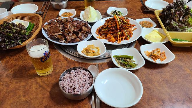 막내는 학교 때문에 못오고 가족 셋이서 나들이 나왔습니다. 식당은 노포분위기 좋구요. 예약을 해야한해서 1시로 예약했는데 손님이 별로 없네요. ^^ 돼갈 3인분과 오징어회무침 1접시입니다. 가격도 저렴하고 양은 충분하네요. 맛있게 먹었습니다. 즐거운 하루되세요~ ps. 제가 단골인 집이 아니고 상호가 단골집입니다. ^^