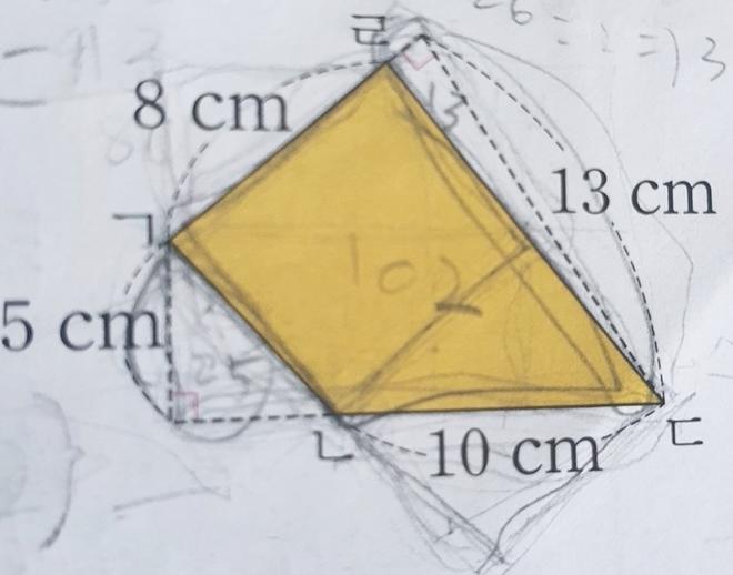 삼각형 ㄱㄴㄷ 의 밑변이 10, 높이가 5인 것이고, 삼각형 ㄱㄹㄷ 의 밑변이 8 높이가 13인 겁니다.