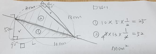 5x10/2 + 8x13/2 = 25+52=77 삼각형 넓이 : 밑변 x 높이 / 2