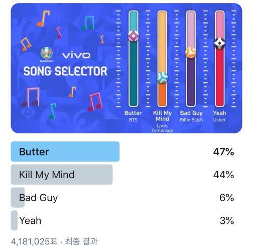 https://sports.v.daum.net/v/20210707000918269 결승전에 나올지 4강전에 나올지는 확실치 않지만 득표 1위니 결승전에 나올 것으로 보입니다. 제가 알기론 최초로 웸블리 구장에서 공연을 한 아시아 가수도 BTS로 알고 있는데 또 한번 웸블리에서 BTS 노래가 울려퍼지겠네요.