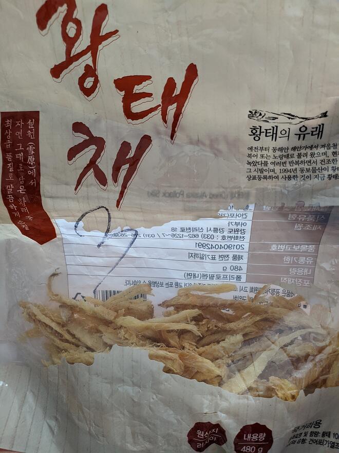 바로 황태채입니다. 육포에 비해 가격은 절반이하이며 술안주로도 매우 좋구요. 100그램당 단백질함량이 무려 80그램에 육박하구요.