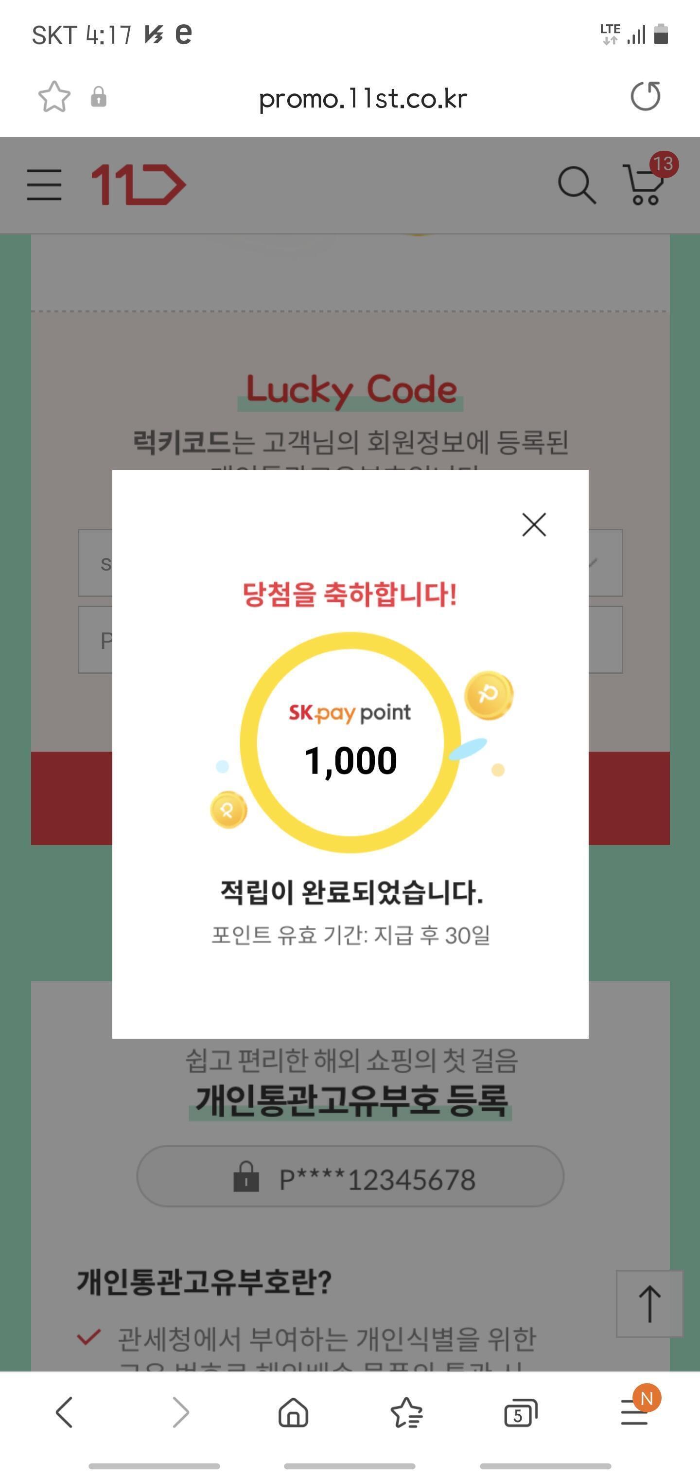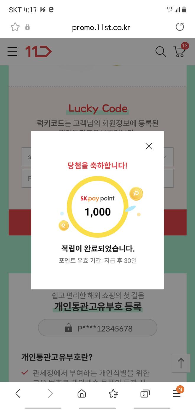 유효기한 30일이니 천원이면 날리지 말고 기한내 사용하세요. 11번가에서 물건 주문하면서 SK 페이 옵션으로 결제할 때만 적립금처럼 사용 가능합니다.