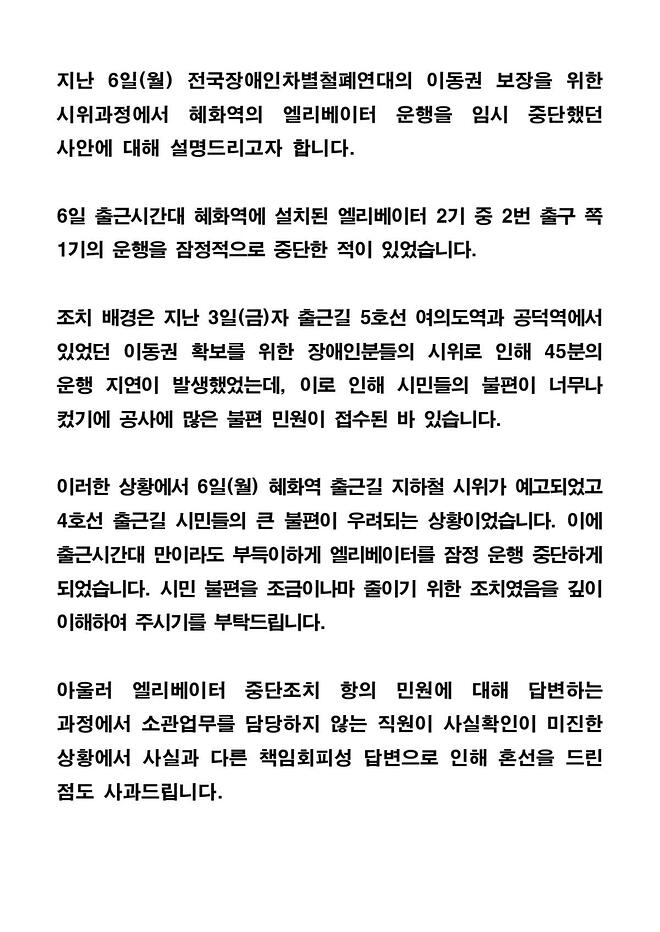 다수의 시민이 큰 불편을 겪을 수 있는 출근길 지하철을 이용한 시위는 가급적 자제해 주시기를 간곡히 부탁드립니다. > 지들이 뭔데 집회 시위의 자유를 제한하려 드나요.