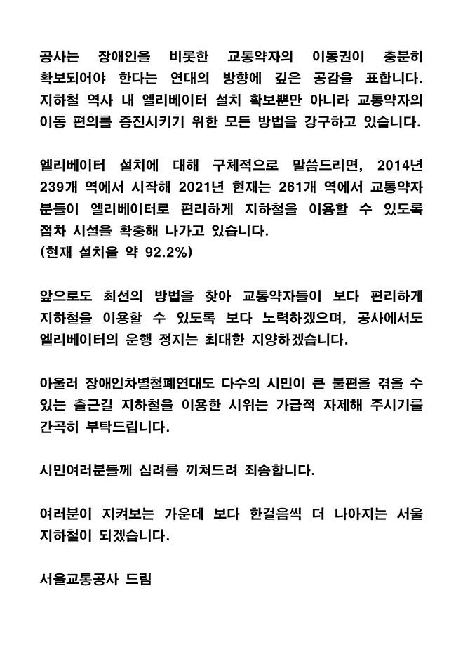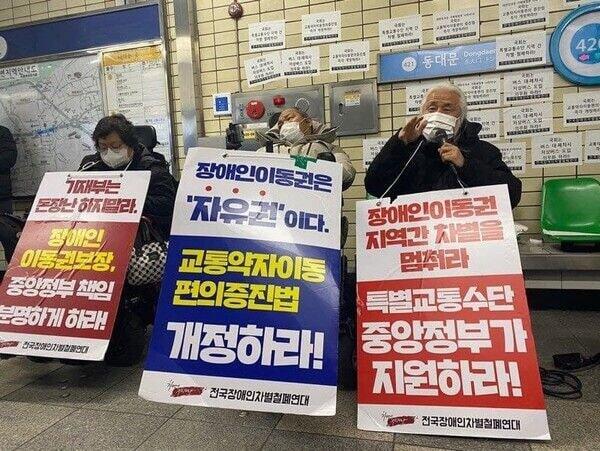 https://twitter.com/seoul_metro/status/1468174291980398602?s=20 장애인분들은 '시민'도 아니고 출근도 안해요? 이딴걸 입장문이라고 내놓다니... 장애인분들 시위도 출퇴근 방해하는게 아니라 선전전만 한다고 했었는데...또한 시위에 참여하지않는 교통약자들이 아침에 그로 인해 이동을 못했다면 그건 누가 책임지거죠
