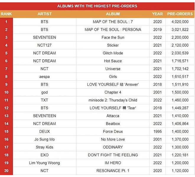세븐틴이 220만장이고 nct가 210만장인데 과연 저 두 그룹의 존재를 아는 사람은 여기서 몇명이 될까하는...