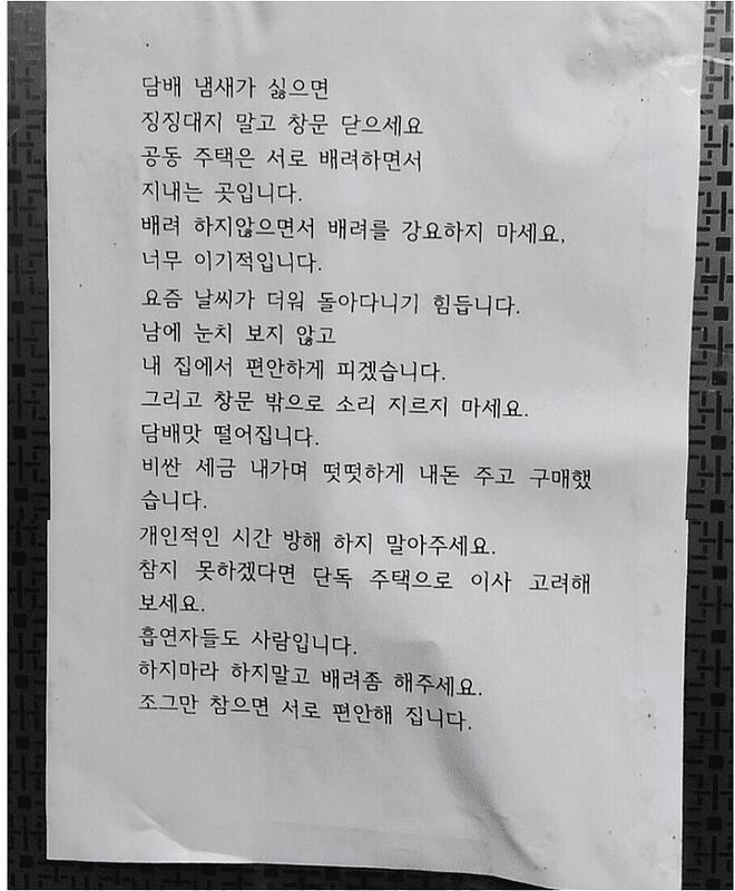 그러면 남들 배려하기 위해서 본인이 완전 밀폐할 수 있는 창호 다 달고, 화장실 배기구도 다 밀폐한 후에 꼭꼭 걸아잠구고 담배 태우시던가~