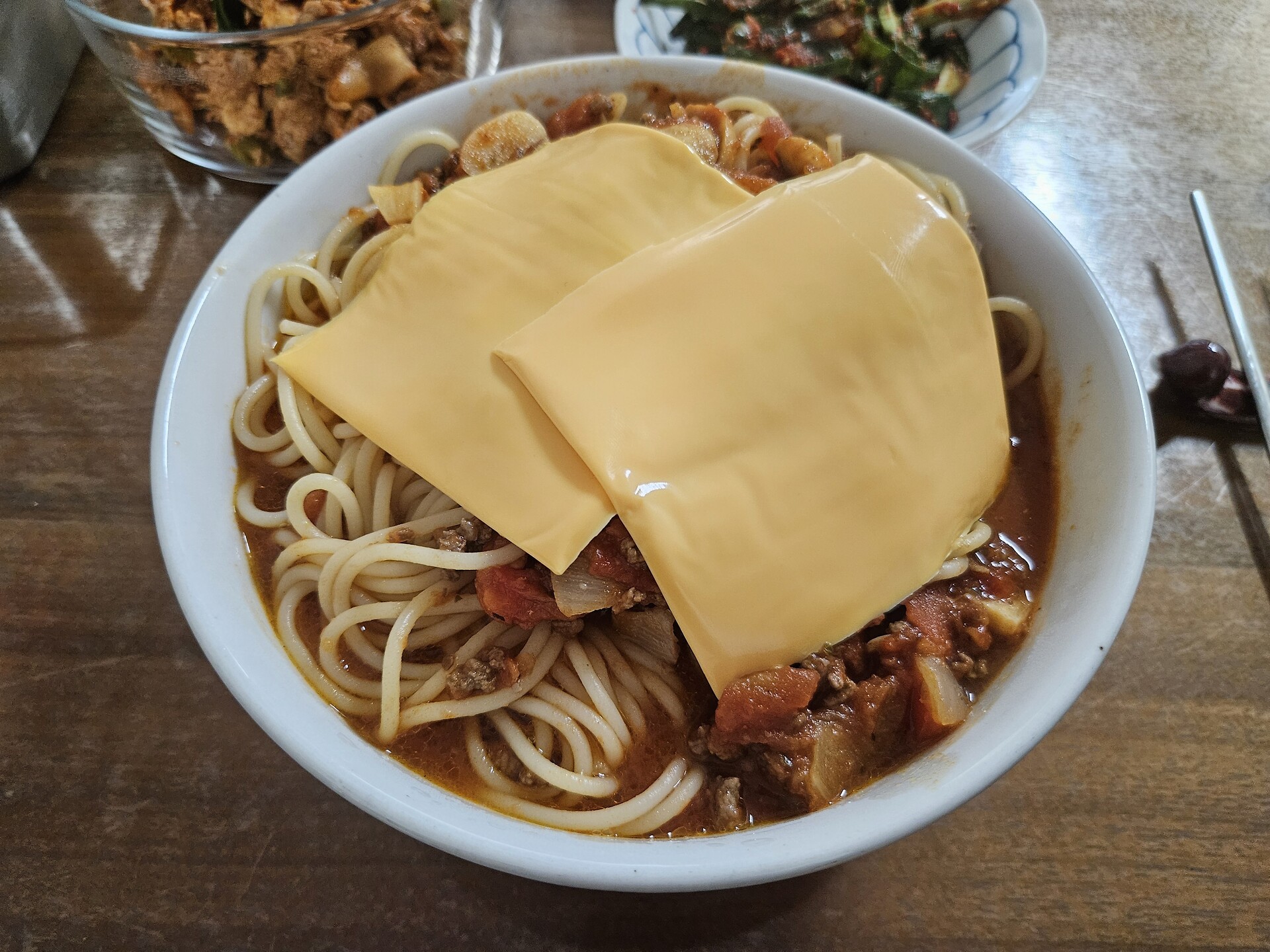 원래는 그냥 토마토 소스 스파게티를 만든 건데, 일반적인 양으로 만들면 제가 항상 부족하다고 느끼기 때문에 마나님이 좀 많이 만들었고, 양껏 담다 보니 접시가 좀 넘칠 것 같아 가장 큰 대접에 담았더니 비주얼이 마치 짬뽕스러워졌네요.