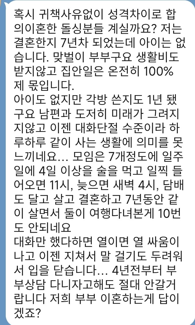 아이도 없는데 저런 상황에서 굳이 같이 살 필요가.. 아직 결혼 7년차면 젊을텐데 이혼하고 혼자 살든 다른 사람을 만나든 하는게 낫겠네요.