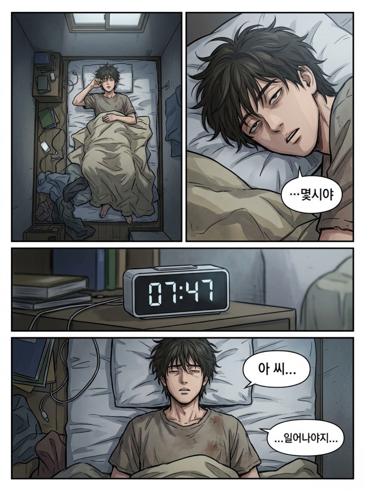 옷도 갈아입지 않고 그대로 자리에 누운 주인공. 풀샷. 탑뷰.