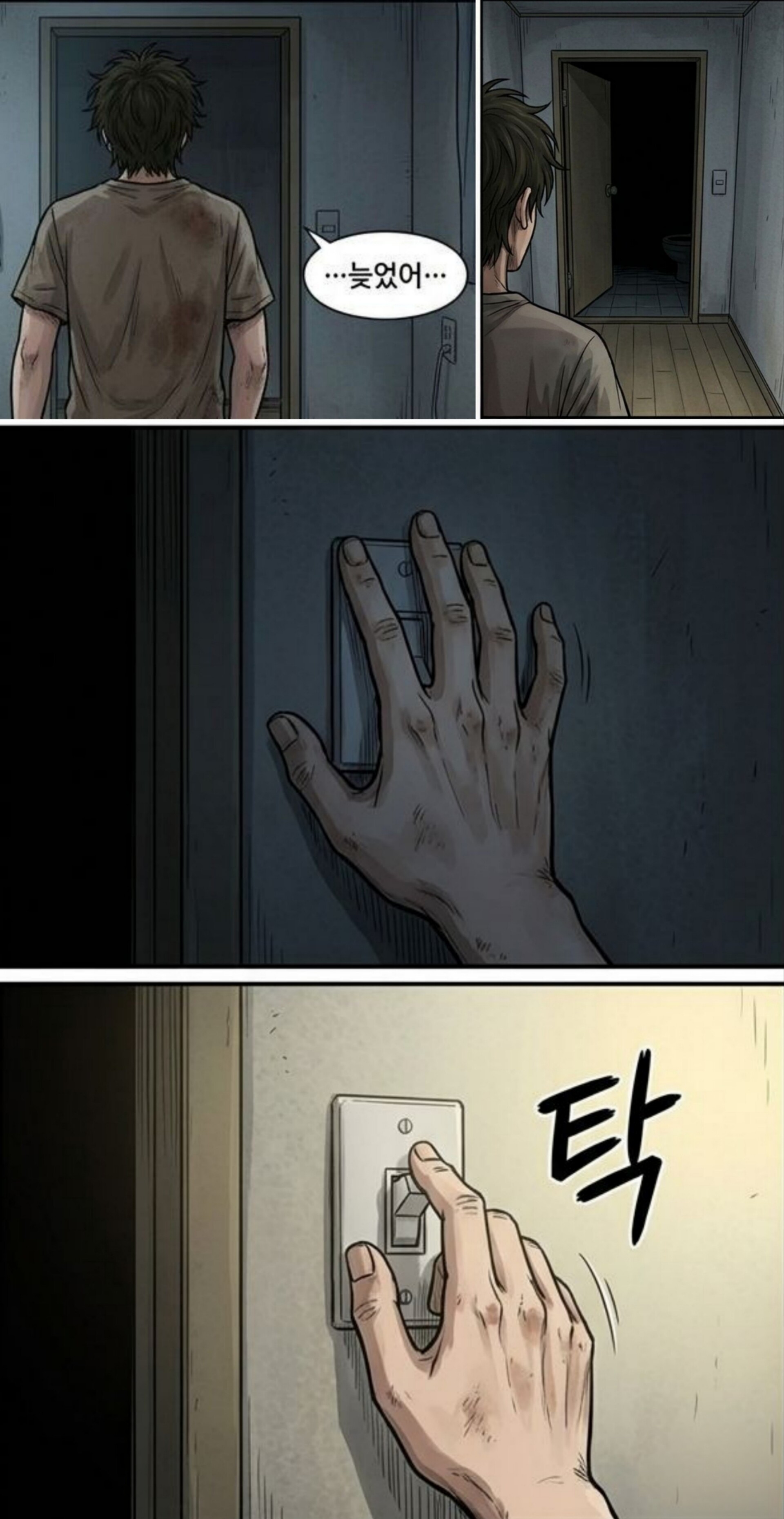 스위치를 더듬어 찾는 주인공의 손 클로즈업