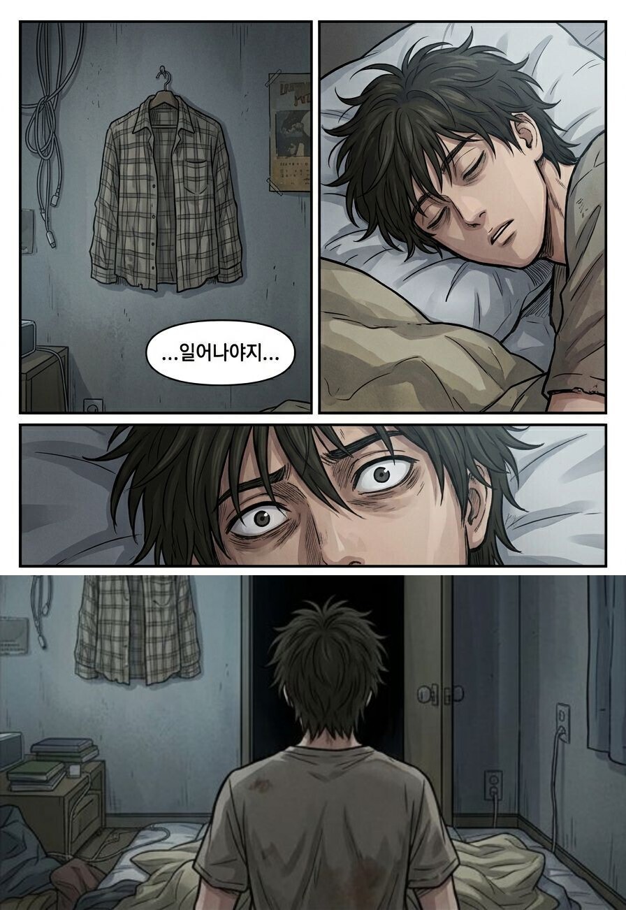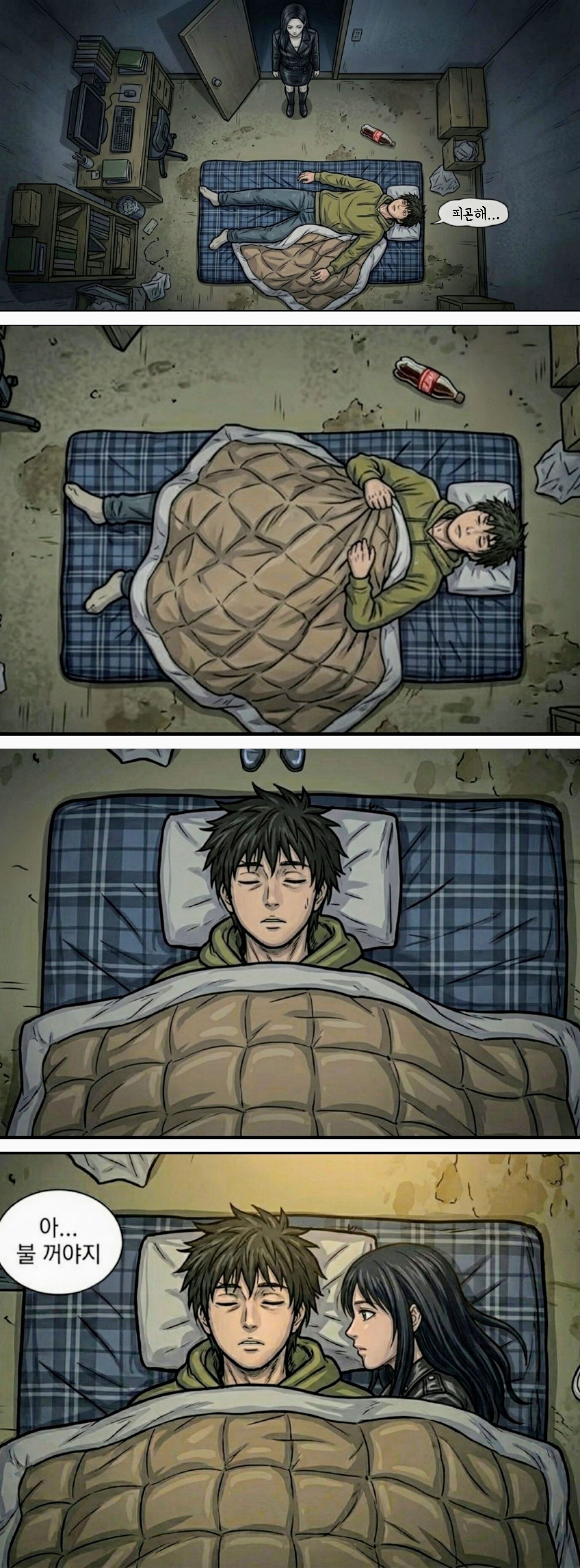 5. 주인공이 자취방에 도착함. 여전히 여자는 업혀있음. 이 자취방을 단독주택 2층, 옥탑방, 원룸 뭘로 설정하는게 무서울지는 좀 생각을 해봐야할듯. 주인공은 술을마셔 갈증이 나는지 바로 비닐봉지에서 음료를 꺼내 따 먹고 대충 옷을 벗어던진 뒤 침대에 누워 잠을 청함. 아, 침대보다는 바닥에 이불을 깔고 자는게 그림이 더 잘 나올지도 모르겠다.