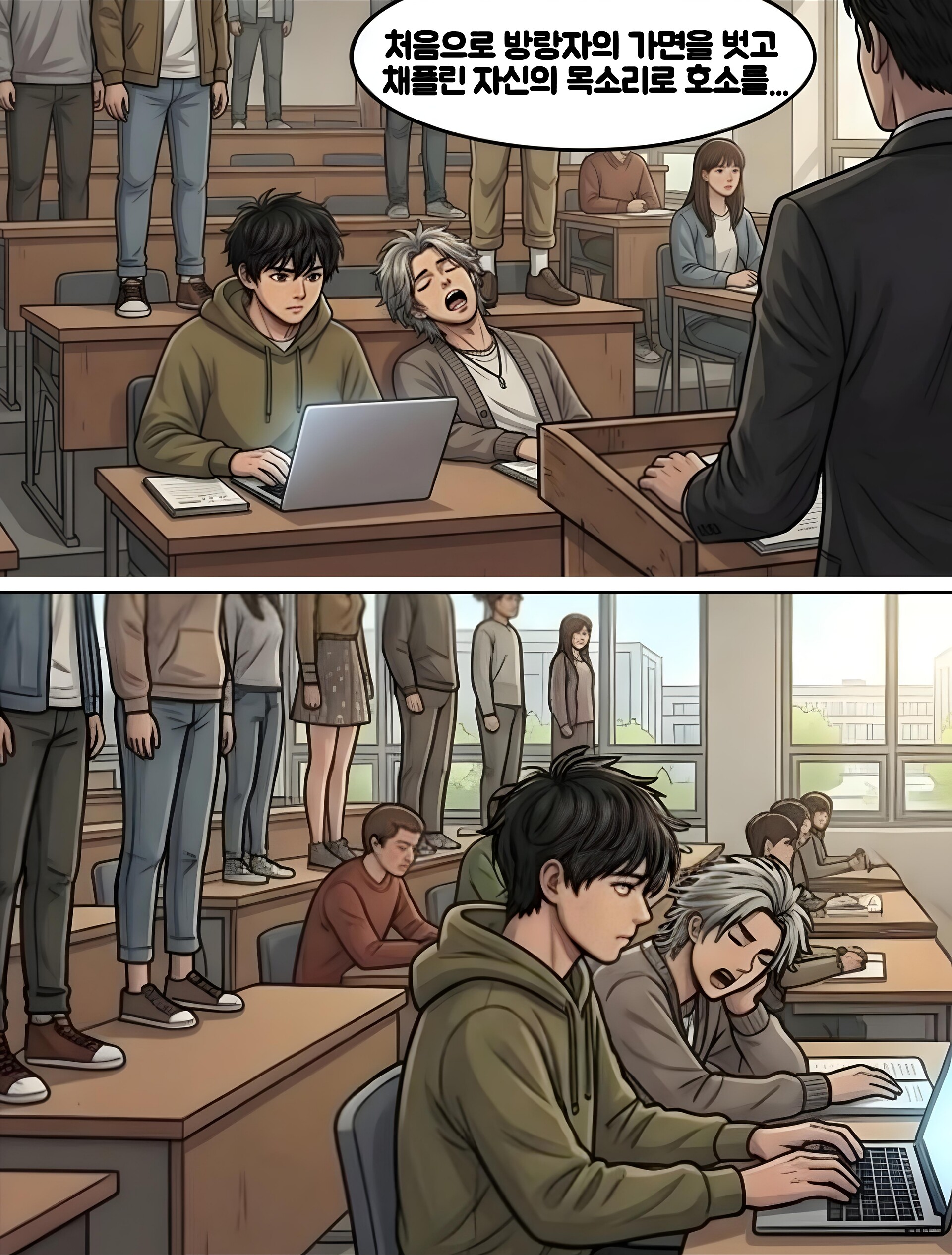 그런데 의아하게도 책상 '위에' 올라가 서있는 학생들도 여럿 보임(마치 죽은 시인의 사회의 마지막 장면처럼)