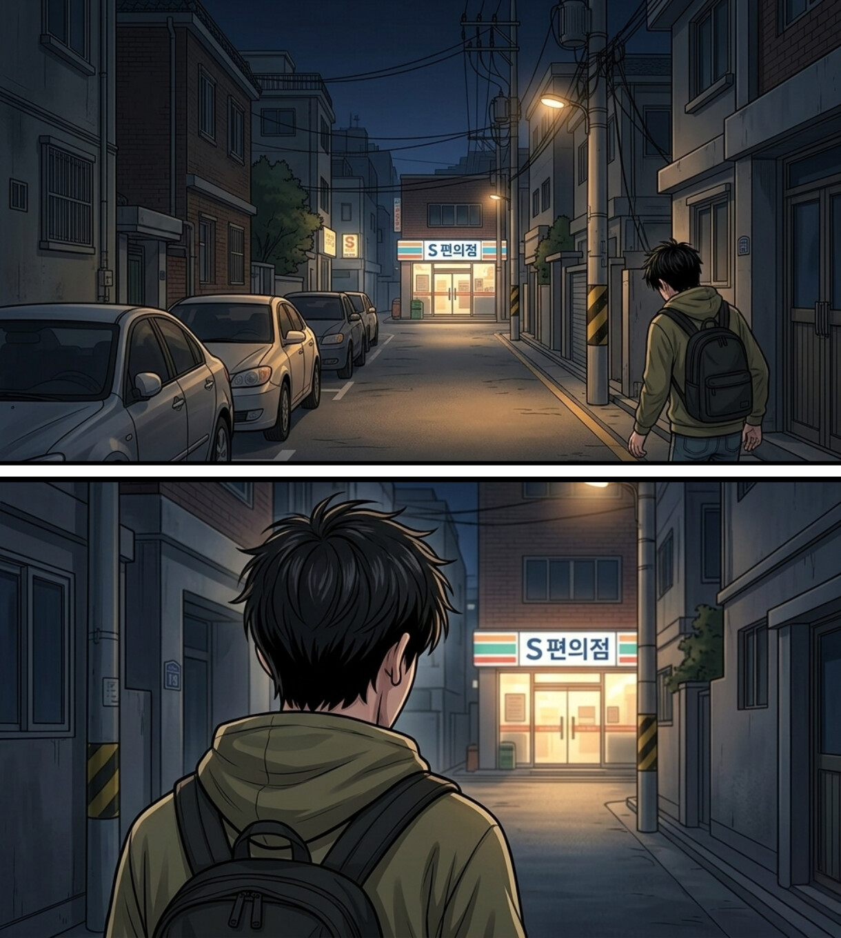주인공의 등과 뒤통수가 보임, 바스트샷. 주인공 어깨 너머 꽤 먼 거리에 불이 환히 들어와있는 편의점이 보임.