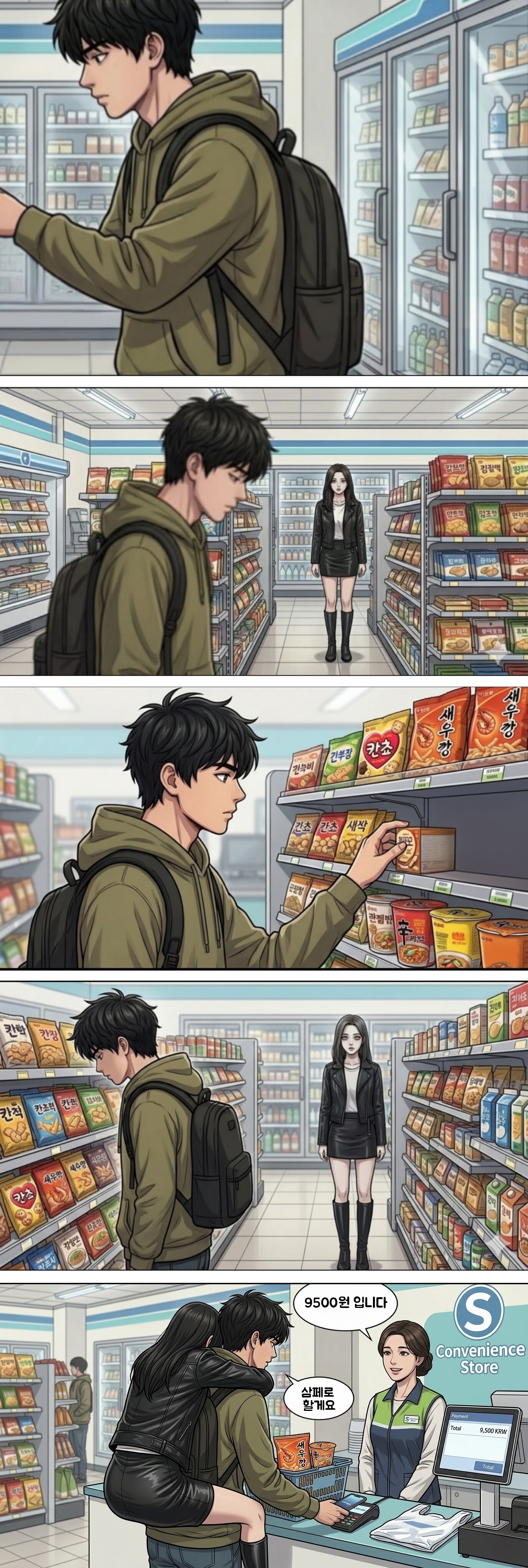 편의점 내부, 주인공의 측면이 보이는 구도. 웨이스트샷. 편의점에 비치되어있는 녹색 플라스틱 장바구니에 물건을 담는 주인공. 장바구니 안엔 과자 몇 봉지와 음료수, 삼각김밥 등이 들어있는데 제대로 구분될 필요는 없음.