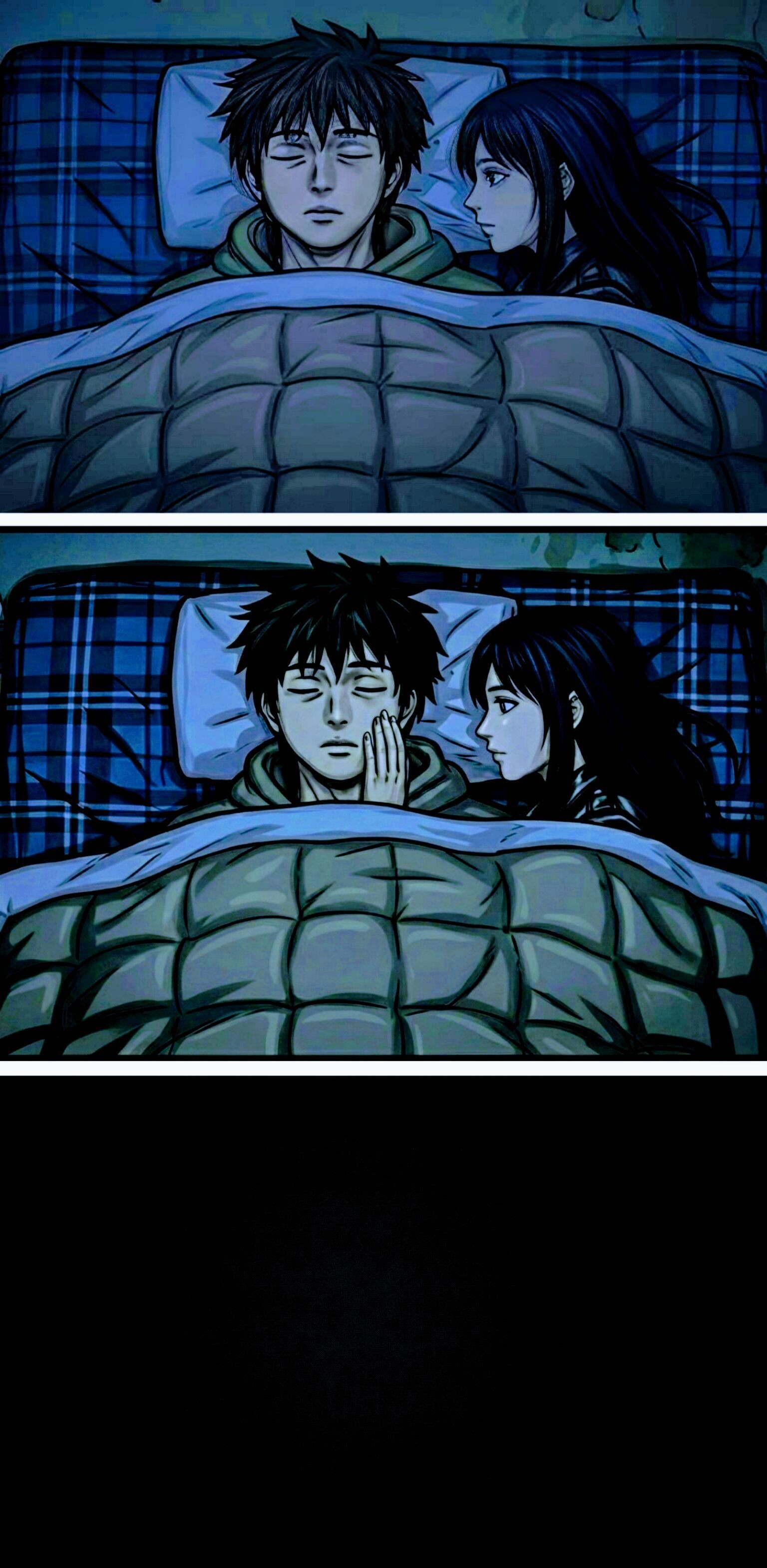 웨이스트샷. 가슴까지 이불을 덮고있는 주인공 눈을 감고있음. 역시 주인공의 왼편에서 이불을 덮고 주인공을 향해 몸을 돌려 옆으로 누운 여대생의 모습이 보임.