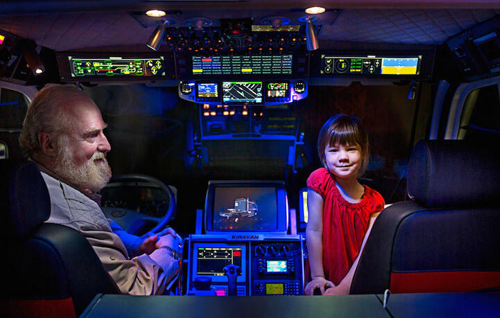 http://www.wired.com/2014/04/worlds-biggest-rv/#slide-id-636212 손녀 딸이 아니라 늦둥이로 낳은 친딸이고, 4년간 살았던 것이 아니라 친딸이 4살이며, 대륙 횡단과 세계여행을 나설 참이라 여행용 밴을 저렇게 만든 것 이라네요.