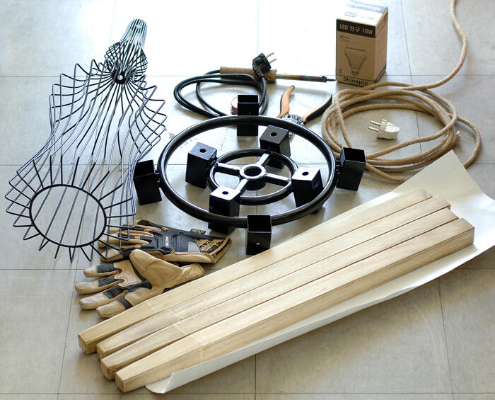 준비물은 한지(삼합지), 각목, 인두, 스트리퍼, 작업용 장갑, 밧줄형태의 익스펜더를 입힌 전선 2.5M, LED 전구(10W), 나무를 고정시킬 쇳덩이(설계 후 주문제작)와 사진에 없는 기타 자잘한 공구가 필요하며 여태 만든 조명 중 가장 높은 금액의 재료비가 들어갔습니다.