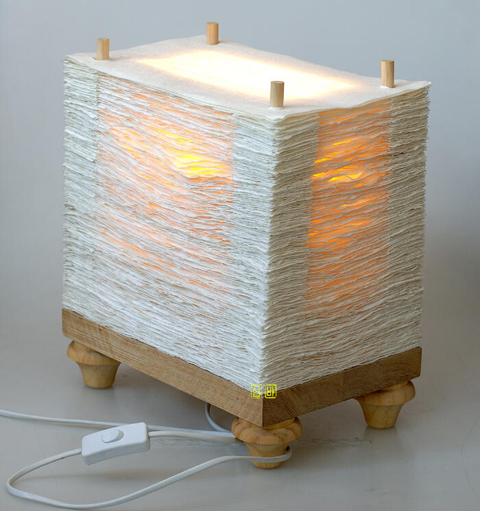 직접 설계하고 주문제작 한 검정색 철제 갓 내부에 들어갈 한지 갓을 실린더 형태로 만들고 나서 물풀을 먹이고 말리고를 최소 세번을 반복하여 두꺼운 삼합지를 더욱 빳빳하게 만들어 줍니다. 그리고 각목에 오일을 바른 후 하루동안 건조 후에 100방짜리 사포로 거칠게 연마하여 빈티지스러운 느낌을 냈습니다.
