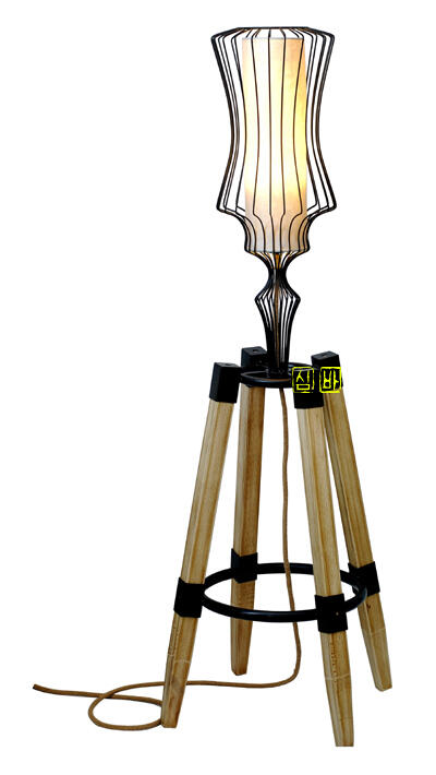 한지 갓 내부에 전구소켓과 전선을 납땜하고 전구를 끼운 후 모든걸 조립하여 완성된 최종 사진입니다. 제작기간은 약 일주일이 소요되었고 전체 높이는 약 127cm이며 쇳덩어리 덕분에 무게가 꽤 나가서 안정적인 형태를 취하고 있습니다.