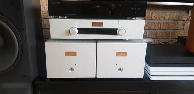 어제 잠시 들어봐서 아직은 어떤지 잘 모르겠고 이것을 가져온 이유는 모노블럭 파워앰프 내부의 만듬새가 트로이달 300W 트랜스가 각 2조 들어가 있고 출력이 채널당 215W 8옴 이라 기존 마란츠 14S1SE 의 90W 출력보다 스피커를 핸들링 하는데 보다 여유가 있을것 같아서 들고 왔습니다. 몇일 들어보면 어떤 성향인지 알 수 있을것 같습니다^^ 짝퉁이라도 보기는 괜찮네요...ㅎ